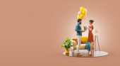 wesoły Azji kobieta siedzi na fotel w pobliżu modny mężczyzna i przezroczysty parasol na szary