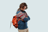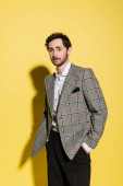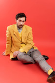 pełny widok długości człowieka w żółtej kamizelce i spodnie siedzi w fotelu na szarości