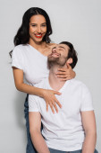 wesoły Azji kobieta w skóra pullover opierając się na modny mężczyzna odizolowany na szary