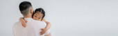 ładny Azji kobieta w biały kurtka i czapka opiera się na mężczyzna odizolowany na szary, sztandar