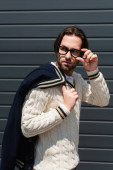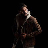 stylowy mężczyzna w niebieskiej kurtce i białej czapce patrząc na aparat odizolowany na szarości