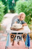 Piękna dziewczynka w koszyku z balonem i tortem świętuje swoje pierwsze urodziny