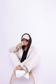 wysoki kąt widzenia modne azjatyckie kobieta regulacja okulary podczas siedzi na szary