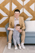 Piękna dziewczynka z tatą w koszyku z balonem i tortem świętuje swoje pierwsze urodziny