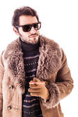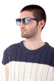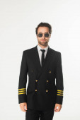 modny mężczyzna w białym swetrze i ciemnych okularach przeciwsłonecznych patrząc na aparat odizolowany na szarości