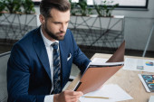 stylowy biznesmen piszący w pustym notatniku przy papierach na biurku