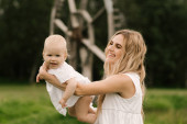 Zdjęcie "Piękna młoda mama z roczną córką w naturze, dziewczyna stawia pierwsze kroki" może być wykorzystywane do celów osobistych i komercyjnych zgodnie z warunkami zakupionej licencji Royalty-free. Obraz jest dostępny do pobrania w jakości wysokiej rozdzielczości do 5760x3840.