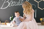 Piękna młoda matka z uroczą córką na polu słoneczników