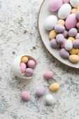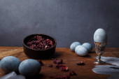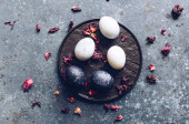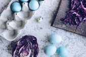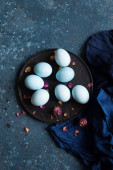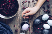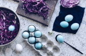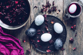 Zabarwione pisanki z marmuru efekt kamienia malowane z naturalnych barwników karcade herbaty z kwiatów hibiskusa na ciemnoniebieskim tle betonu. Widok z góry.