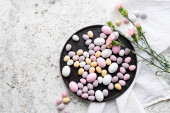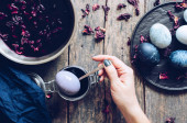 Zdjęcie "Zabarwione pisanki z marmuru efekt kamienia malowane z naturalnych barwników karcade herbaty z kwiatów hibiskusa na ciemnoniebieskim tle betonu. Widok z góry." może być wykorzystywane do celów osobistych i komercyjnych zgodnie z warunkami zakupionej licencji Royalty-free. Obraz jest dostępny do pobrania w jakości wysokiej rozdzielczości do 5760x3840.