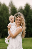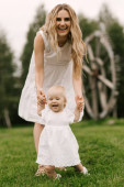 Piękna młoda rodzina mama i tata z roczną córką w naturze, szczęśliwa rodzina na polu słonecznika