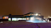 Sundsvall, Szwecja Niebieski parking wieczorem w śniegu.