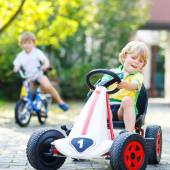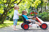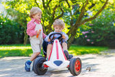 Cute little girl i chłopca szkoły bawiąc się niebieski mały samochód zabawki w ogrodzie domu lub przedszkola. Maluch siostra i brat dzieci dobrze się bawią razem.