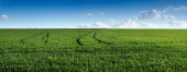 zielone pole młodych pędów, koncepcja rolnictwa, zasadzone pole pszenicy lub żyta oraz niebo z obłokami na wiosnę