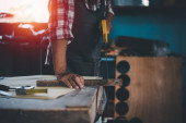 Starszy stary stolarz przy użyciu piły pracującej na rzemiośle w warsztacie do produkcji materiałów budowlanych lub mebli drewnianych.