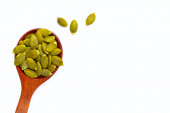 Spice Green Cardamom na drewnianej łyżce izolowane na białym tle. Zielony kardamon to pachnące zioło używane jako składnik do gotowania.
