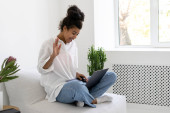 Zdjęcie "Widok z boku atrakcyjnej afrykańskiej dziewczyny trzymając filiżankę herbaty lub kawy w nowoczesnym mieszkaniu w odcieniach bieli. hobby i aktywność Milenium. Czas dla siebie. Odpoczynek na kanapie" może być wykorzystywane do celów osobistych i komercyjnych zgodnie z warunkami zakupionej licencji Royalty-free. Obraz jest dostępny do pobrania w jakości wysokiej rozdzielczości do 5760x3840.