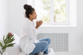 Widok z boku atrakcyjnej afrykańskiej dziewczyny trzymając filiżankę herbaty lub kawy w nowoczesnym mieszkaniu w odcieniach bieli. hobby i aktywność Milenium. Czas dla siebie. Odpoczynek na kanapie