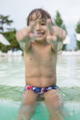 Azji młody chłopiec mając dobry czas w basen, On skacze i gra w wodzie w lecie.