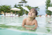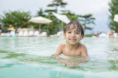 Azji młody chłopiec mając dobry czas w basen, On skacze i gra w wodzie w lecie.
