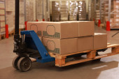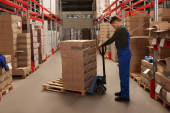 Pracownik przenoszący palety drewniane z ręcznym wózkiem widłowym w magazynie