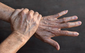 Plamy wiekowe na rękach starszego Azjaty. Są brązowe, szare lub czarne plamy, a także nazywane plamy wątrobowe, starcze soczewica, soczewica słoneczna, lub plamy słoneczne. Pojęcie reumatoidalnego zapalenia stawów, zapalenia kości i stawów, szczepu nadgarstka lub bólu stawów.