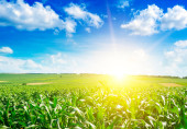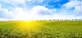 Młode kiełki słonecznika na polu wiosny i jasny zachód słońca