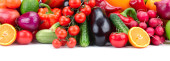 Duża kolekcja wielokolorowe soczyste warzywa i owoce izolowane na białym tle. Widok z góry.