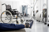 Specjalista od rehabilitacji pomaga facetowi na wózku ćwiczyć