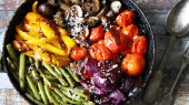 Zdrowa sałatka z marchewką, zielonym groszkiem i niebieską cebulą. Dieta wegańska.
