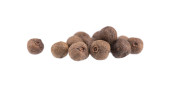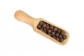 Allspice w drewnianej łyżce, izolowane na białym tle. Pieprz jamajski, jagoda pimento, ziele pieprzowe lub pieprz mirtowy. Widok z góry.
