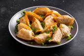 Zdjęcie "Głęboko smażona chrupiąca gyoza z wiosenną cebulą. Żywność azjatycka." może być wykorzystywane do celów osobistych i komercyjnych zgodnie z warunkami zakupionej licencji Royalty-free. Obraz jest dostępny do pobrania w jakości wysokiej rozdzielczości do 5760x3840.