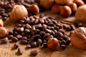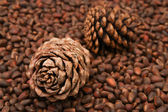 Szyszka syberyjska na drewnianej desce z orzechami sosny.