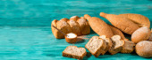 chleb cebulowy na wiejskim drewnianym stole z innymi pieczywami, cebulą i mąką w tle. widok z góry