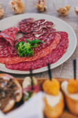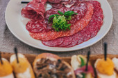 Obsługa stołów gastronomicznych w restauracji przed imprezą. Kanapki z bruschettą z nasionami, mozarellą i pomidorami