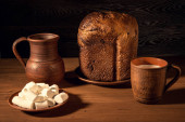 chleb z kakao i czekolady na żółtej tkaninie na rustykalnym drewnianym stole ze składnikami