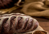 chleb z kakao i czekolady na rustykalnym materiale na wiejskim drewnianym stole ze składnikami.