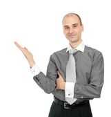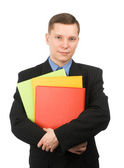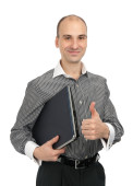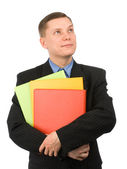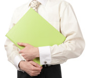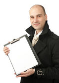 biznesmen, wskazując na pusty arkusz w jego folderze
