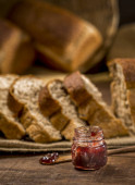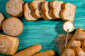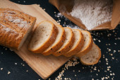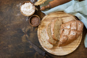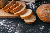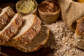 chleb bochenkowy krojony z nasion sezamu (kiełków) na rustykalnym drewnianym stole z innymi chlebami i składnikami w tle.