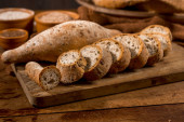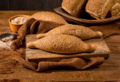 chleb bochenkowy z nasion sezamu (kiełków) na rustykalnym drewnianym stole z innymi pieczywami i składnikami w tle. zbliżenie