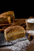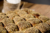 różne rodzaje pieczywa wykonane z nasion sezamu (kiełków) na rustykalnym drewnianym stole z innymi pieczywami i składnikami w tle.