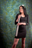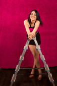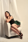 Piękny, młody, biały gitl stojący obok fotela.