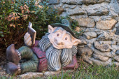 kolorowy goblin leży w ogrodzie i czyta książkę - dekoracja ogrodu