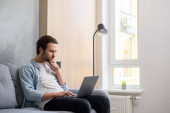 Optymistyczny człowiek siedzący na kanapie i używający laptopa do wysyłania wiadomości. Szczęśliwy biznesmen pracujący zdalnie w spokojnej pozie