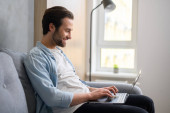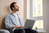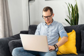 Zdjęcie "Praca zdalna. Pionowe ujęcie białego mężczyzny odpoczywającego na kanapie podczas pracy na laptopie w domu" może być wykorzystywane do celów osobistych i komercyjnych zgodnie z warunkami zakupionej licencji Royalty-free. Obraz jest dostępny do pobrania w jakości wysokiej rozdzielczości do 5760x3840.