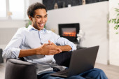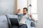 Praca zdalna. Pionowe ujęcie białego mężczyzny odpoczywającego na kanapie podczas pracy na laptopie w domu