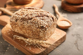 cały bochenek chleba zbożowego na wiejskim drewnianym stole