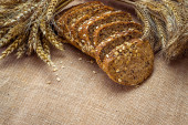 chleb pełnoziarnisty z nasion sezamu, nasion słonecznika, lnu, płatków owsianych, jęczmienia, żyta, chia, nasion dyni, maku, gałki muszkatołowej, na rustykalnym drewnianym stole z innymi pieczywem i składnikami w tle. napis na górze widoku
