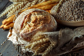 chleb pełnoziarnisty z nasion sezamu, nasion słonecznika, lnu, płatków owsianych, jęczmienia, żyta, chia, nasion dyni, maku, gałki muszkatołowej, na rustykalnym drewnianym stole z innymi pieczywem i składnikami w tle. napis na górze widoku