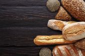 Zdjęcie "chleb pełnoziarnisty z nasion sezamu, nasion słonecznika, lnu, płatków owsianych, jęczmienia, żyta, chia, nasion dyni, maku, gałki muszkatołowej, na rustykalnym drewnianym stole z innymi pieczywem i składnikami w tle. napis na górze widoku" może być wykorzystywane do celów osobistych i komercyjnych zgodnie z warunkami zakupionej licencji Royalty-free. Obraz jest dostępny do pobrania w jakości wysokiej rozdzielczości do 5760x3840.